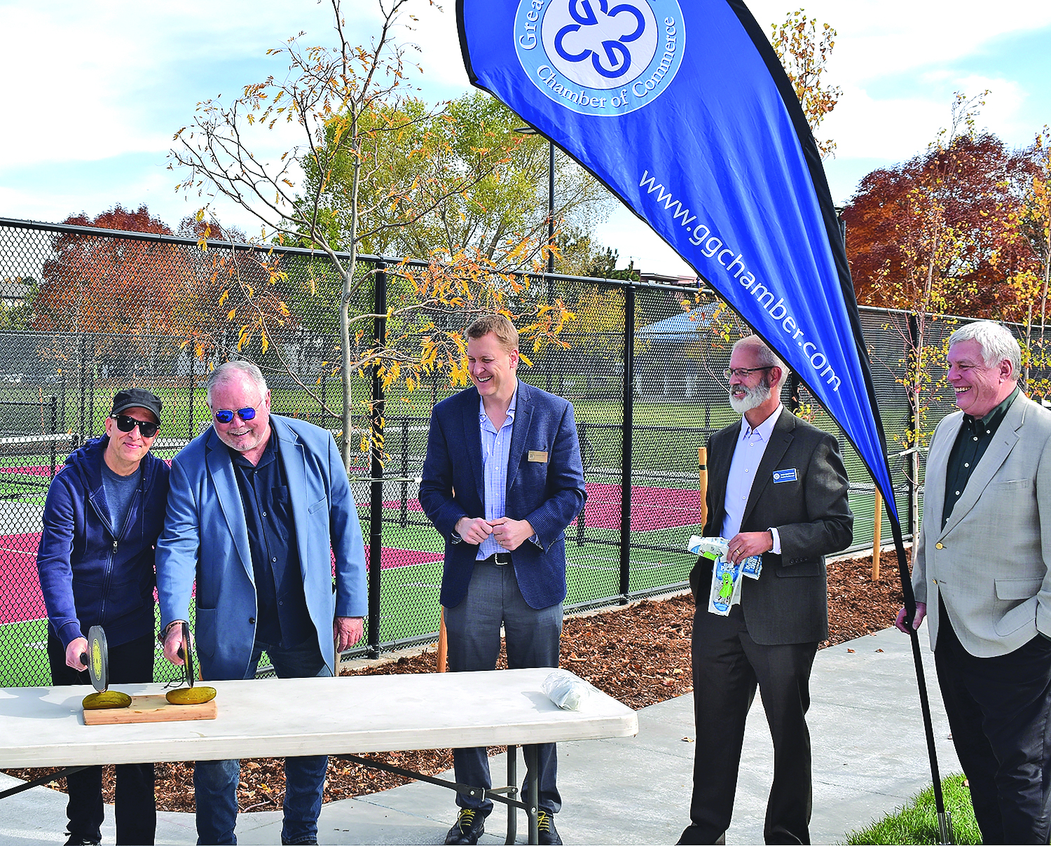 From left to right: Mayor Pro-Tem Storm Gloor; Mayor Mike Dunafon; Chuck Line, Glendale City Manager; Josh Bertrand, Glendale Deputy City Manager; and Jeff Allen, Glendale Chamber COO, cut the pickle to officially open the new outdoor pickleball courts in Glendale.