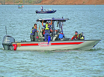 SMFR Water Rescuers conduct a search of the lake at Chatfield State Park on July 7, 2025. SMFR were called to the park after a paddle-boarder had fallen off his paddleboard. The call came in just after 4 p.m. and after an extensive grid search, divers were able to recover the victim shortly after 7 p.m. Photo courtesy of SMFR