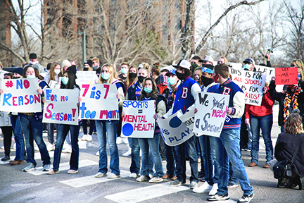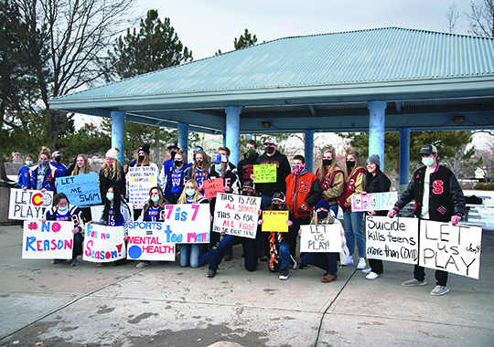 Colorado high school athletes hold signs in protest of the postponement of Season B sports. Photo by Jessica Hughes