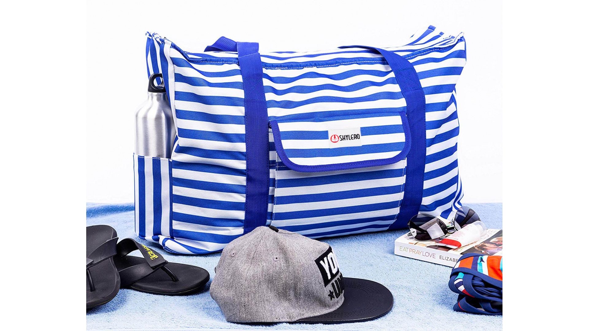One to consider purchasing for such a trip is the SHYLERO Beach Bag XL. This beach bag is durable and waterproof which is important when trying to keep your items dry at the pool or beach. It features a canvas-like fabric with ripstop construction and can easily hold 22 pounds of items.