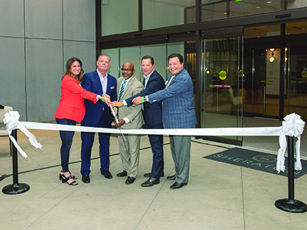 Unveiling Becomes Official: Mayor Michael Hancock cuts the ribbon to unveil the $80 Million renovation to the Sheraton Denver Downtown. From left to right: Rachel Benedick, Executive Vice President, Convention Sales & Services at VISIT DENVER; Tony Dunn, General Manager of Sheraton Denver Downtown; Mayor Michael Hancock; Steve Arnold, Principal at Sea Hospitality; J.J. Ament, CEO of Denver Metro Chamber. Photo by Photography G, Inc.