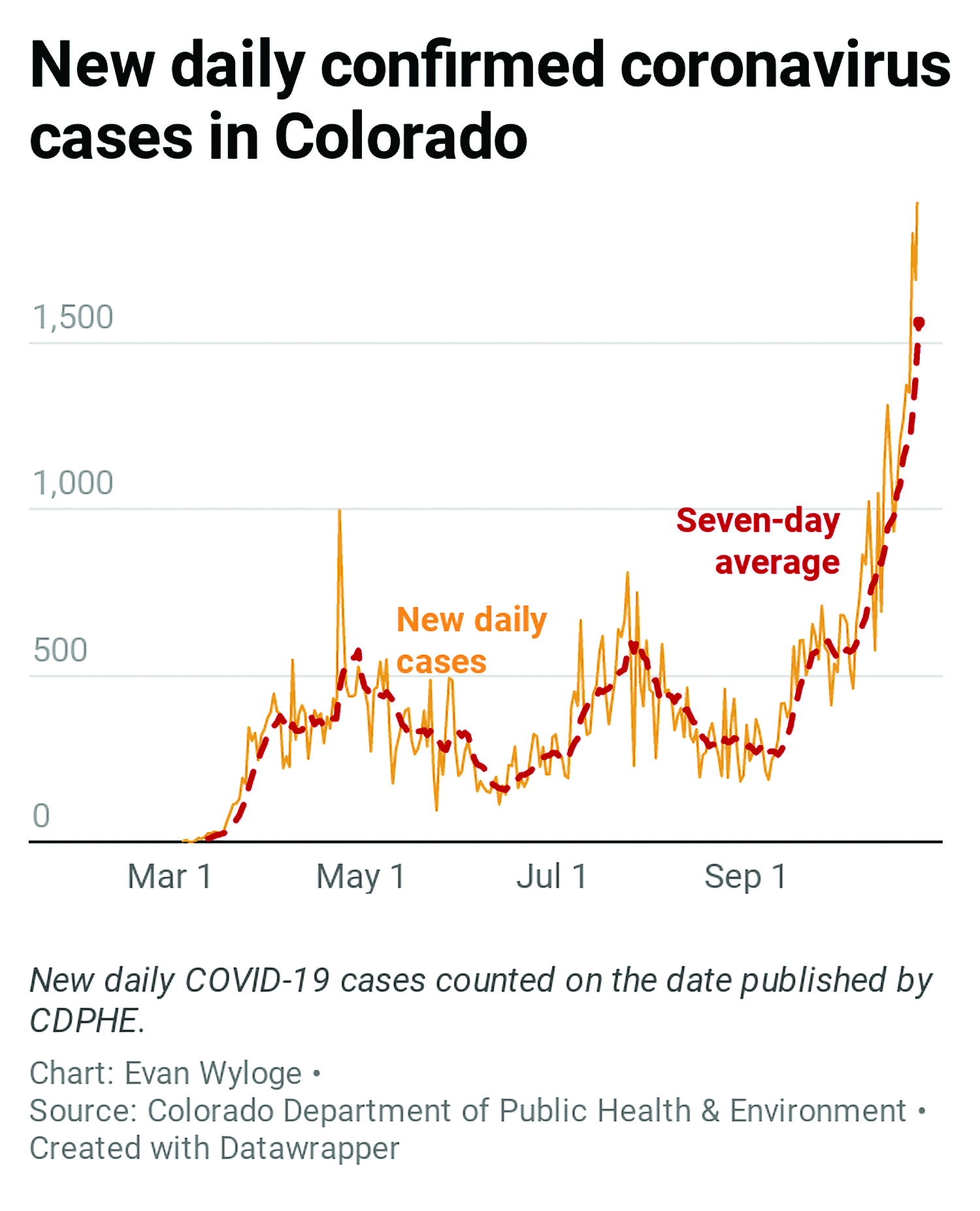 Colorado Cases Spike: Daily Covid-19 cases in Colorado started ramping up in May and were soaring by early Sept. The Colorado Public Health & Environment chart was created by Evan Wyloge.