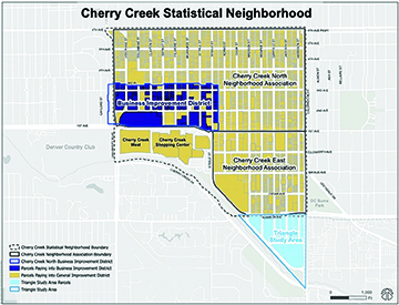 Map: A City of Denver map showing the Cherry Creek Statistical Neighborhood and proposed General Improvement District (GID) boundaries. The highlighted areas include the existing Business Improvement District (BID), Cherry Creek North and East Neighborhood Associations, and the “Triangle Study Area” south of 1st Avenue.