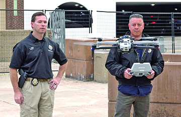 Drone Duo: Denver Police Sgt. Jeremy Cain (left) and Det. Jeremy Casias fly a drone outside of the Cherokee St. headquarters.