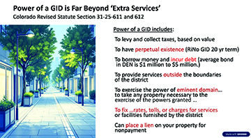 Cherry Creek resident Frank Ooms and other residents believe that the special districts like the Cherry Creek GID were examples of gross overstepping by the Denver City government and its complete lack of fiscal responsibility and policy. Ooms emphatically stated that the proposed GID was “a quick money grab for the City to raise funds for carrying out their own agenda for what they determine are needed improvements rather than actually representing the needs or wishes of Cherry Creek residents.”