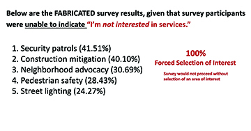 Because anyone could take the survey — even those living outside the proposed district — residents questioned its legitimacy. Many felt it was designed to create a false narrative of support rather than