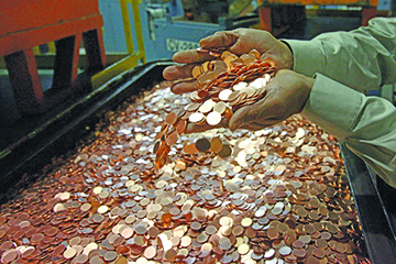 Penny Scoop: Denver Mint’s Guillermo Hernandez scoops a handful of “cents blanks” that will be stamped into pennies.